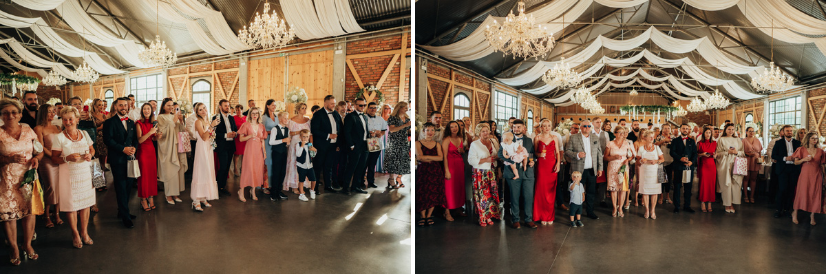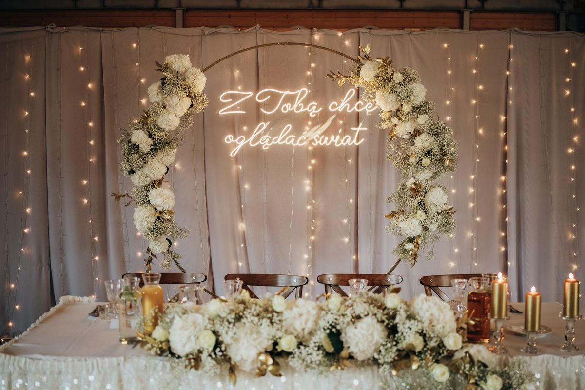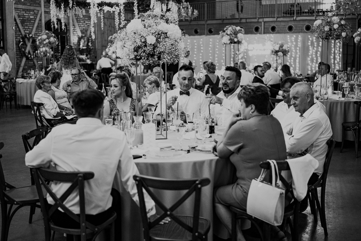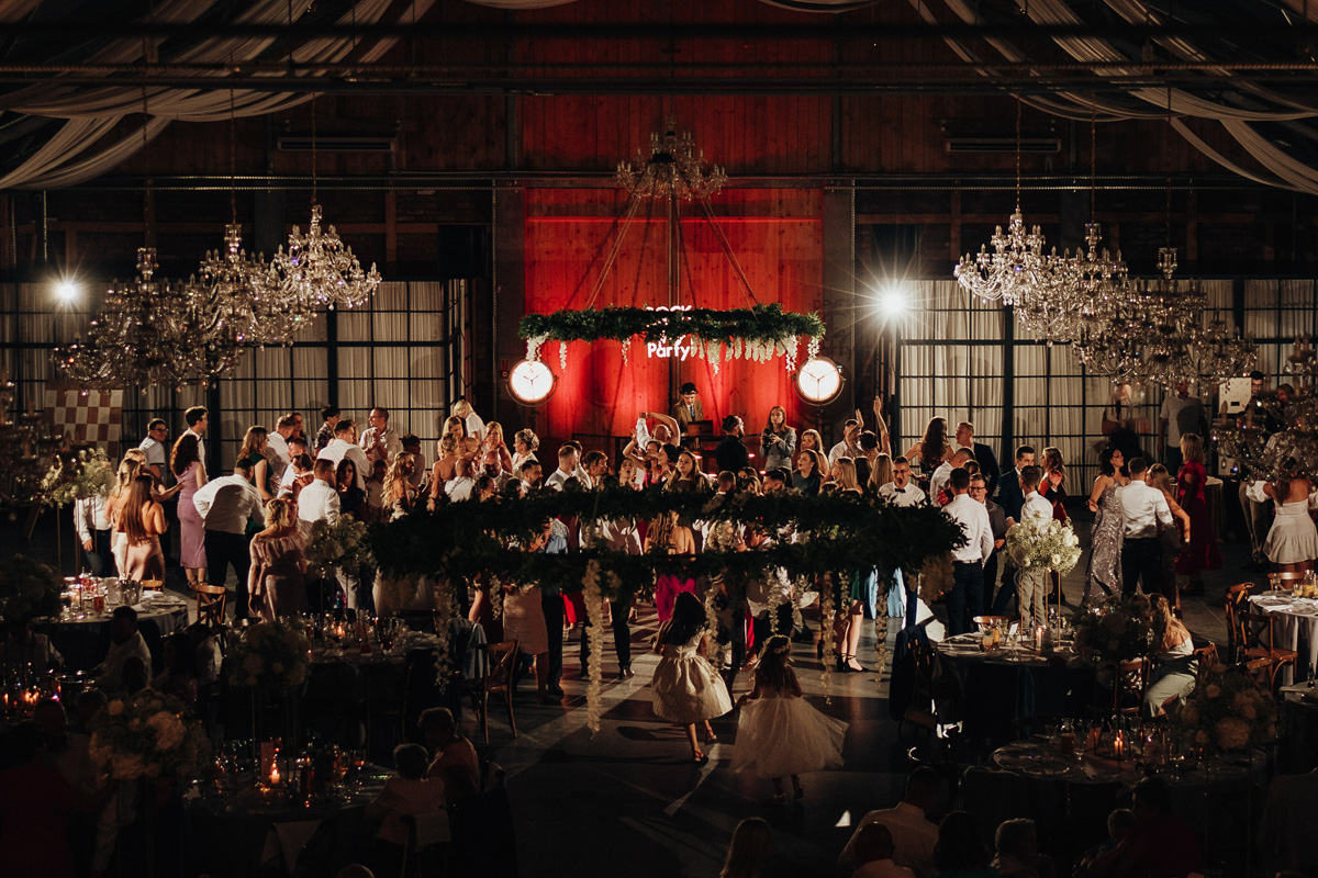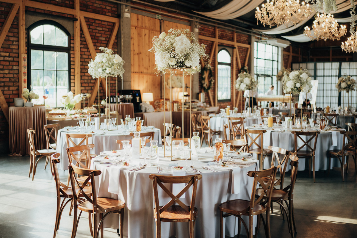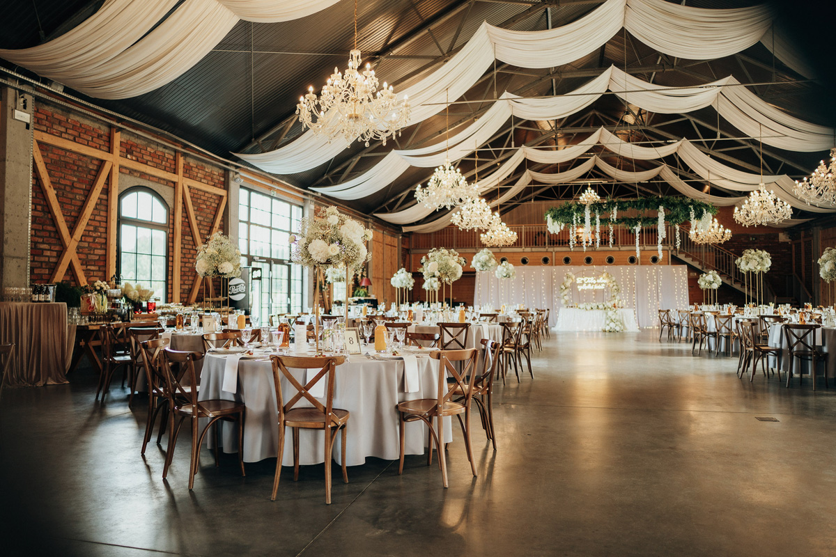 Przestronność i elegancja – strefa zabaw dla gości, stoły okrągłe, prostokątne oraz układ mieszany. Wnętrze zdobią duże kryształowe żyrandole i girlandy na suficie, a wysokie okna wpuszczają dużo naturalnego światła