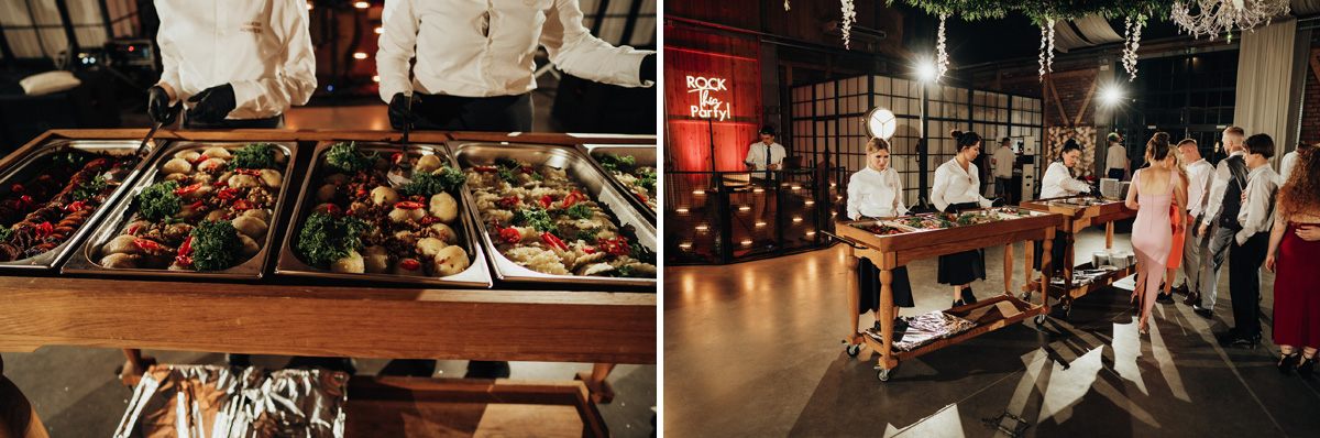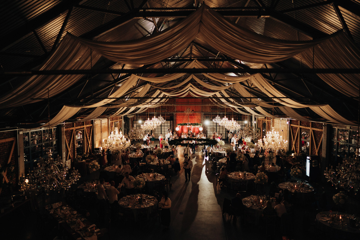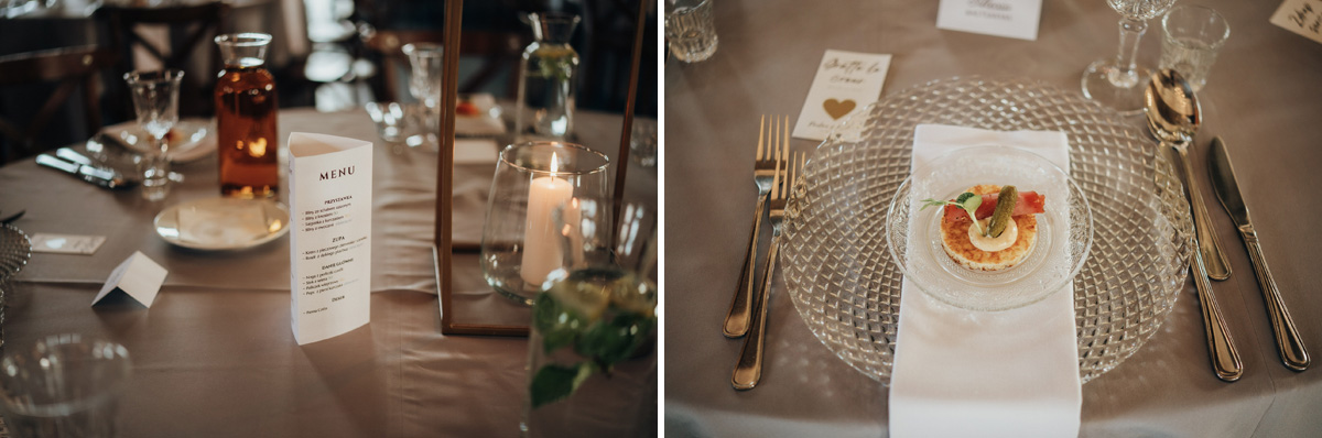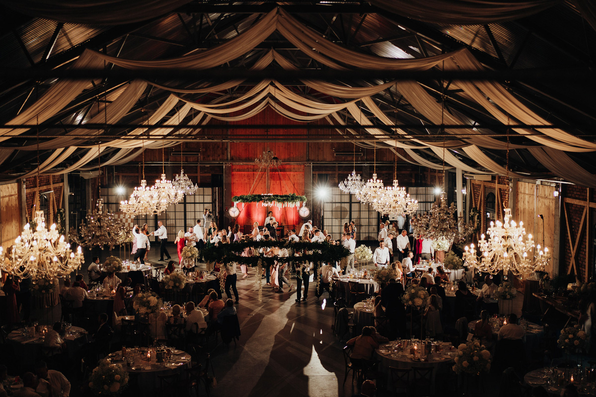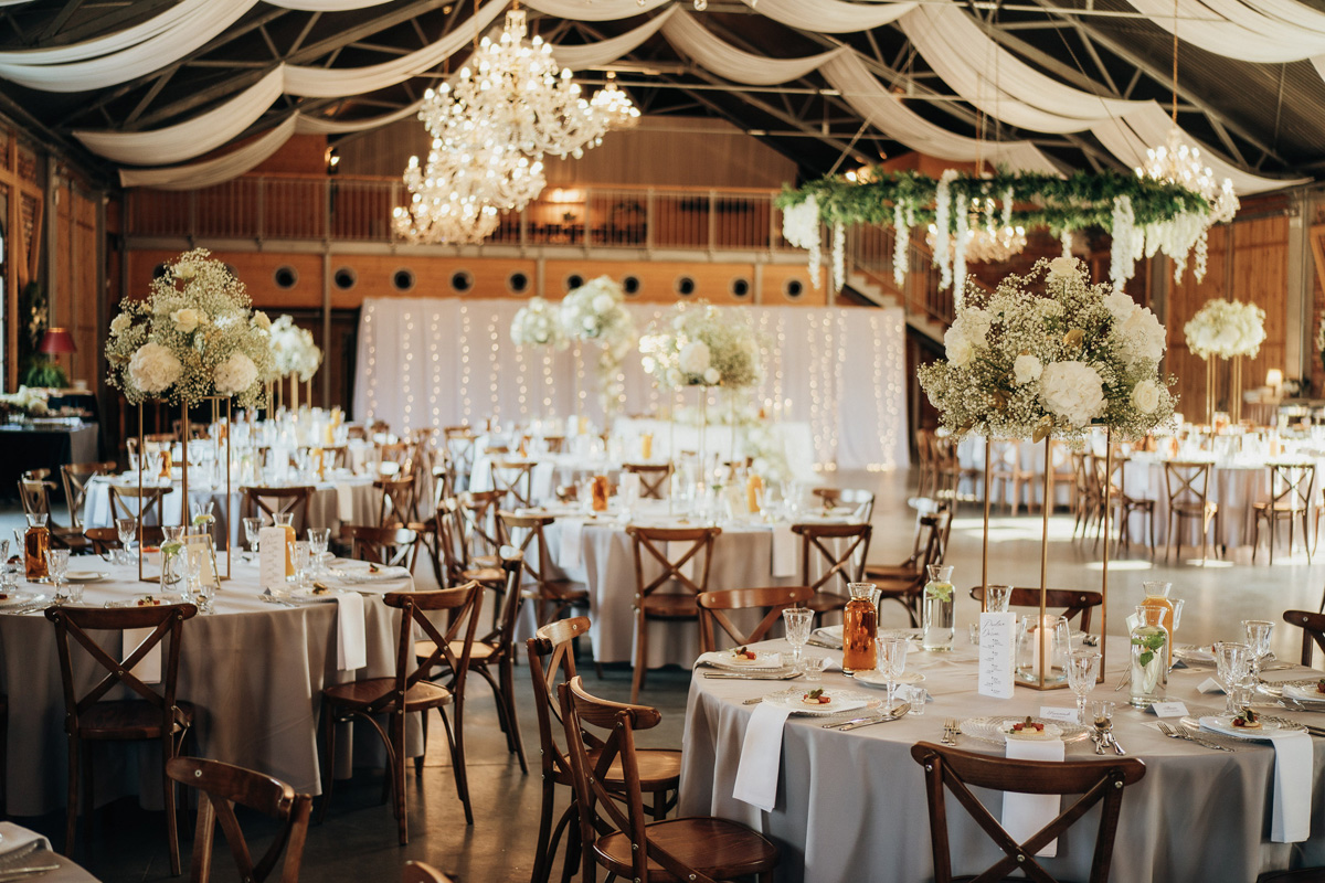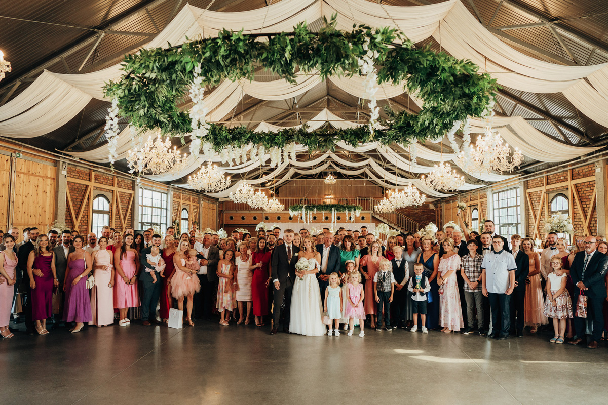 Przestronność i elegancja – strefa zabaw dla gości, stoły okrągłe, prostokątne oraz układ mieszany. Wnętrze zdobią duże kryształowe żyrandole i girlandy na suficie, a wysokie okna wpuszczają dużo naturalnego światła